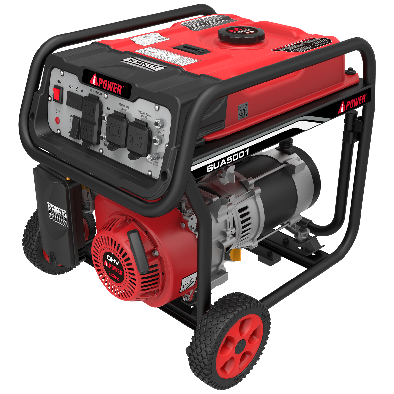 The A-iPower SUA5001 5000-Watt Generator has a performance series 223cc OHV engine with a cast iron sleeve and low oil shutdown. Offering 5,000 starting watts, with 4,250 running watts, the unit’s four-gallon fuel tank offers an extended run time of 13 hours at 25% load.